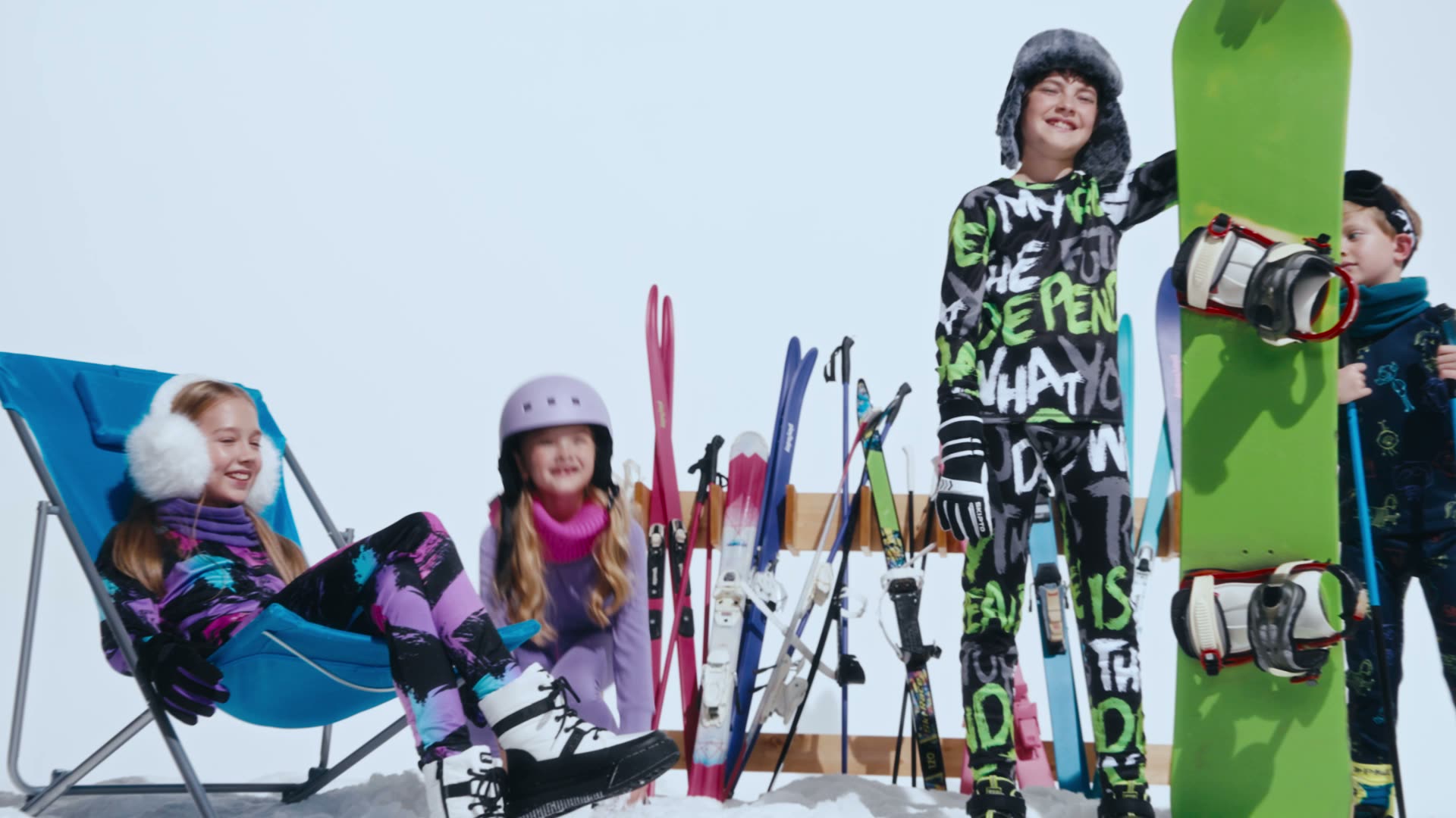 Теплые и непродуваемые шапки и балаклавы повторяют стиль курток и комбинезонов. Принты и светоотражающие элементы делают ребенка заметным на склоне — важный нюанс для родителей, которые хотят быть спокойны за безопасность.